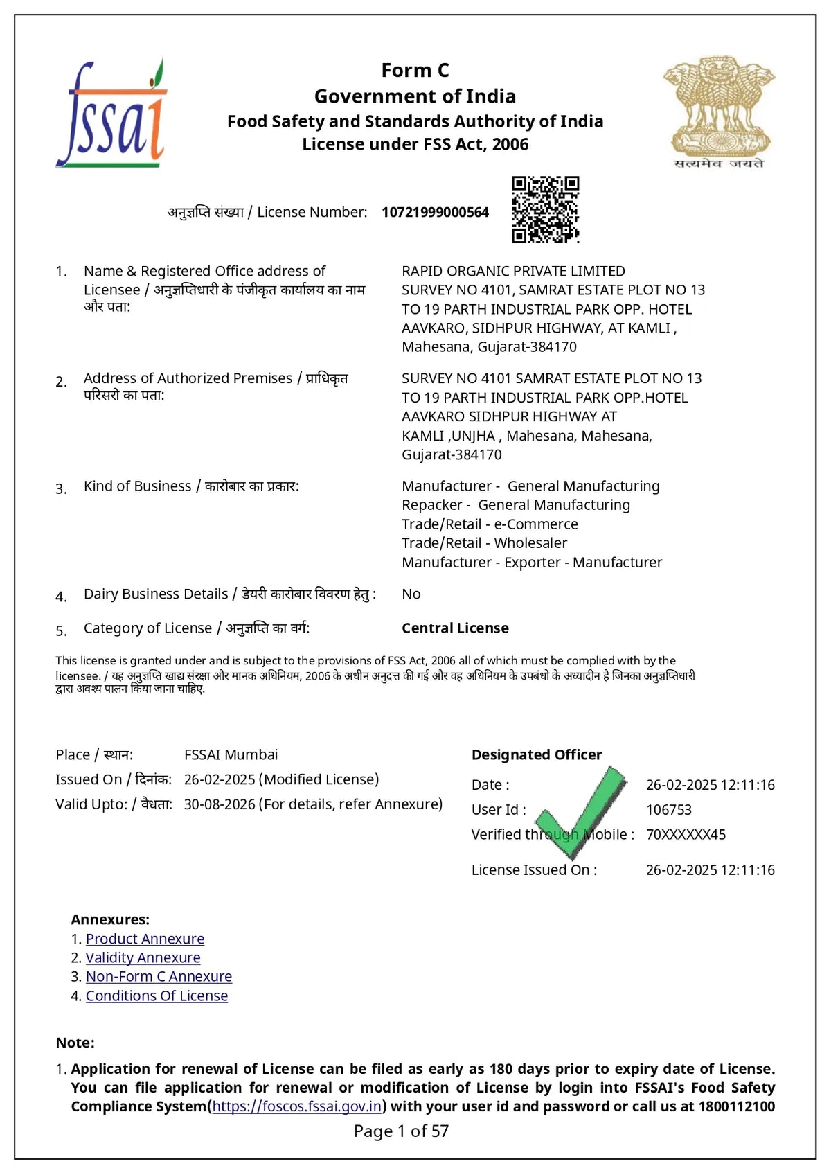FSSAI License Number: 11516035000355