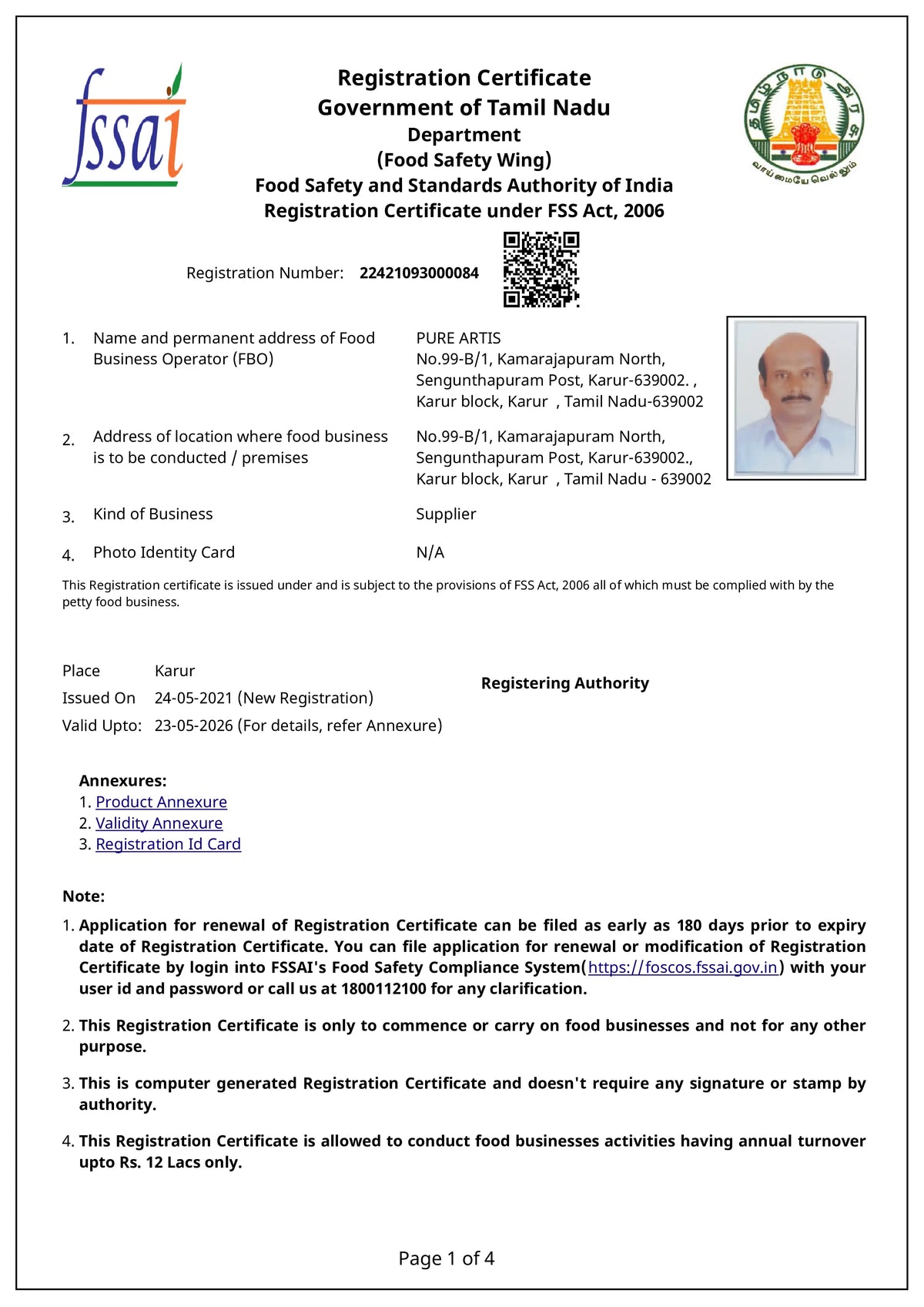 Manufacturing and FSSAI Details